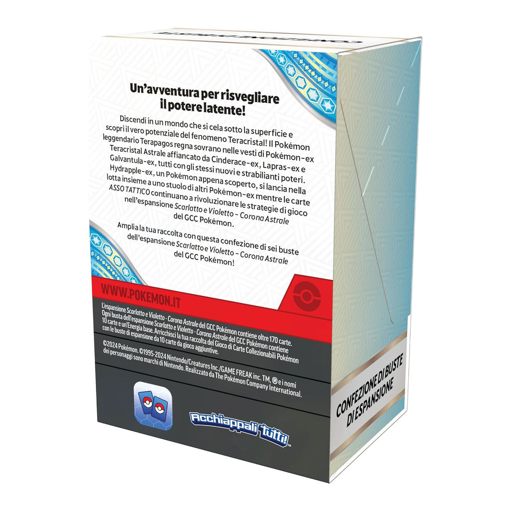Discendi in un mondo che si cela sotto la superficie e scopri il vero potenziale del fenomeno Teracristal! Il Pokémon leggendario Terapagos regna sovrano nelle vesti di Pokémon-ex Teracristal Astrale affiancato da Cinderace-ex, Lapras-ex e Galvantula-ex, tutti con gli stessi nuovi e strabilianti poteri. Hydrapple-ex, un Pokémon appena scoperto, si lancia nella lotta insieme a uno stuolo di altri Pokémon-ex mentre le carte ASSO TATTICO continuano a rivoluzionare le strategie di gioco nell’espansione Scarlatto e Violetto - Corona Astrale del GCC Pokémon.
