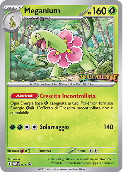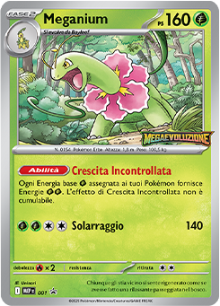Sembra familiare? Questo Meganium ha la stessa abilità, Crescita Incontrollata, della carta di Meganium, pubblicata nell’espansione Neo Genesis. Questa abilità avrà lo stesso impatto di allora in quanto fa sì che ogni Energia base