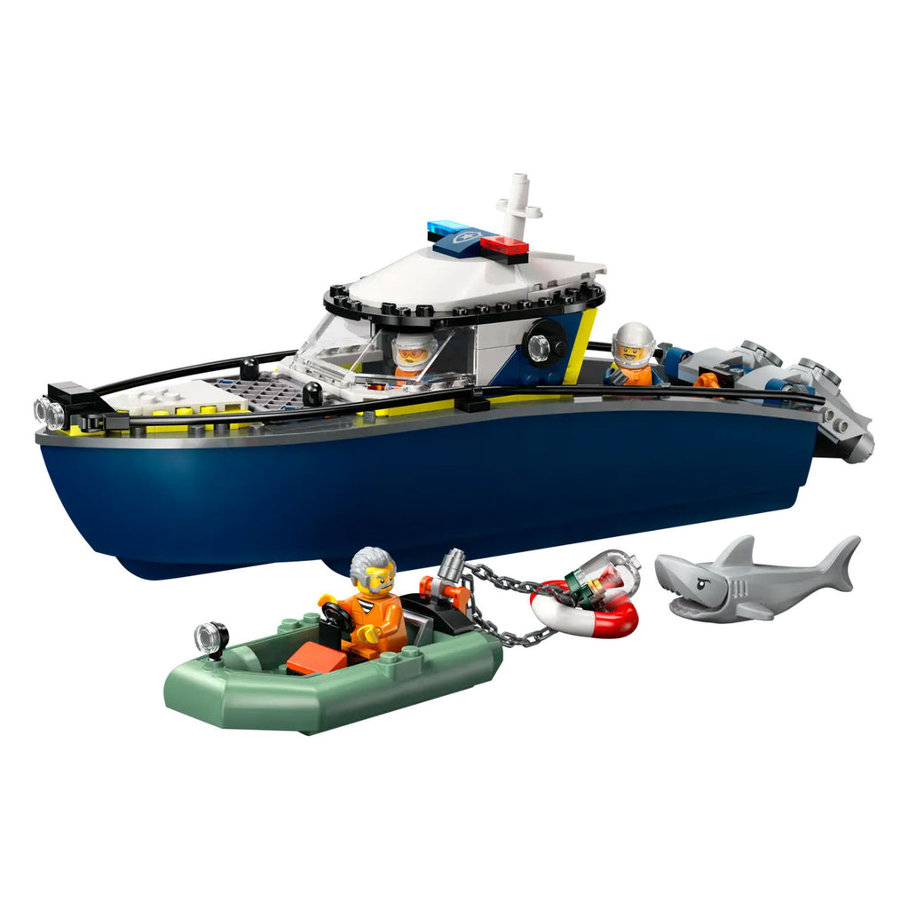 - Cosa c’è nella scatola? Tutto ciò di cui i bambini hanno bisogno per costruire un motoscafo della polizia e un gommone a motore, oltre a 2 minifigure di agenti di polizia, una minifigure di ladro e uno squalo