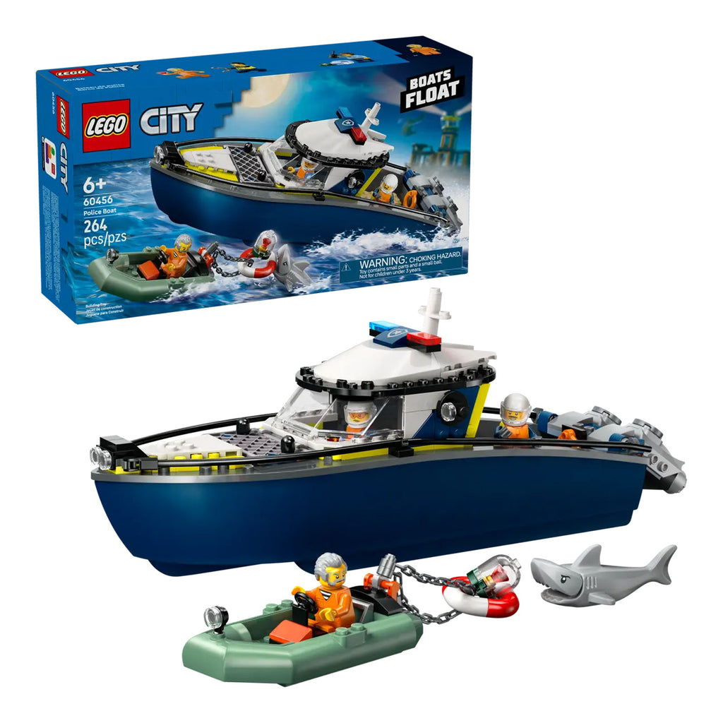 I piccoli eroi di tutti i giorni adoreranno questo playset Inseguimento del motoscafo della Polizia LEGO® City (60456). Perfetto per i costruttori dai 6 anni in su, questo set comprende un motoscafo della polizia con due motori fuoribordo e una cella, oltre al gommone del ladro. I bambini possono far galleggiare entrambe le barche sull’acqua e tuffarsi in emozionanti avventure con 2 agenti di polizia, un ladro, uno squalo con mascelle scattanti e un rubino rubato!