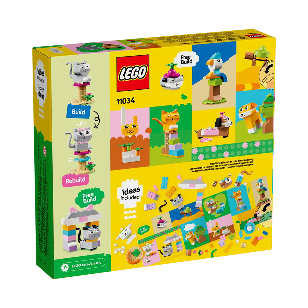 Con 450 mattoncini LEGO, inclusi pezzi speciali con occhi e bocche, e semplici istruzioni passo passo, i bambini possono costruire un cane con una ciotola e un osso, un gatto su un supporto, un criceto con una mela, un coniglio con una carota e un uccello su un trespolo. Quindi, utilizzando i suggerimenti inclusi per colori, forme e funzioni alternative, i bambini possono ricostruire i loro animali domestici in un modo nuovo e divertente. Man mano che le loro capacità di costruzione creativa si sviluppano, i bambini possono provare le loro idee. È anche inclusa una guida con 10 idee per dare il via al divertimento del free-building.