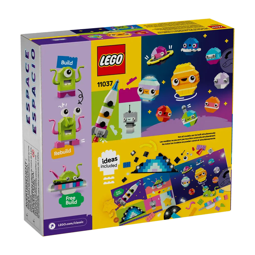 I bambini assemblano i mattoncini colorati per costruire un razzo giocattolo, un alieno, un astronauta e un mini sistema solare che include Marte, la Terra, il Sole e Saturno con i suoi anelli. I modelli spaziali possono quindi essere personalizzati utilizzando colori, forme, occhi, espressioni alternative ed un supporto che consente al modello di ruotare. Ci sono anche mattoncini fosforescenti per la visibilità notturna. La creatività cosmica continua con suggerimenti per costruzioni alternative, incluso un sistema solare completo di 8 pianeti. Guide e funzionalità digitali sono disponibili anche nell’app LEGO Builder.