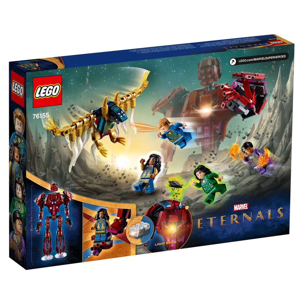 I bambini uniscono le loro forze con quelle dei 4 Eternals per sconfiggere un pipistrello Deviant. Gli Eternals hanno poteri fantastici: Ajak è l'unico in grado di comunicare con i potenti esseri extraterrestri, i Celestial; Sersi trasforma la materia in tutto ciò che desidera; Ikaris ha una forza sovrumana e Kingo può far esplodere l'energia terrestre. Il set include anche il personaggio di un Celestial che può tenere in mano la minifigure di un Eternal. Inoltre, se vuoi fare un regalo a un appassionato di minifigure, questo fantastico set di gioco LEGO è l'unico in cui sono incluse le minifigure di Ajak e Kingo!