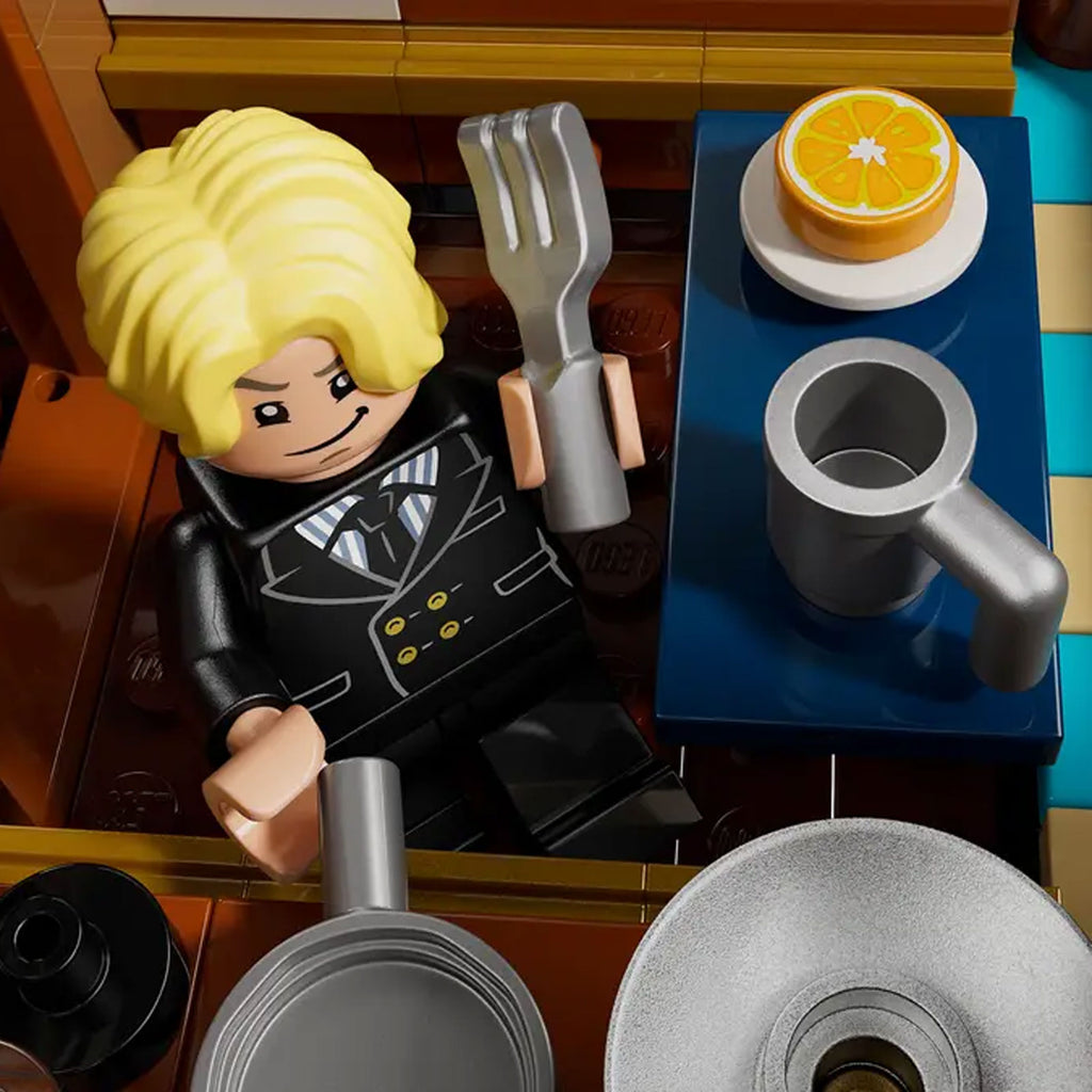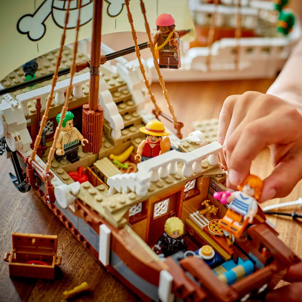 L’iconica nave è dotata di diversi spazi interni: una cabina per l’equipaggio, una cucina, un magazzino e un’officina per gli accessori. Il modello contiene 5 minifigure LEGO ONE PIECE. Luffy siede sulla polena della pecora nella parte anteriore della nave, sotto la quale si trova un cannone; Zoro si rilassa e si allena sul ponte; Nami controlla il timone nella parte posteriore, dove sul ponte crescono i suoi alberi di mandarino preferiti; Usopp si arrampica sugli alberi e fa la guardia dalla coffa; Sanji porta le pentole giù per le scale fino alla cucina. Include 4 poster “Ricercato”. L’app LEGO Builder permette ai bambini di ingrandire, ruotare i modelli in 3D e seguire i progressi. Il set contiene 1.376 pezzi.