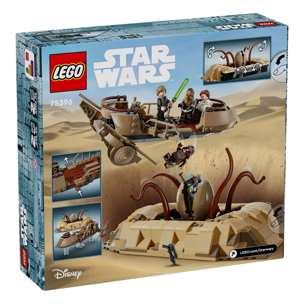 Riproduci un’emozionante scena di Star Wars: Il ritorno dello Jedi e crea nuove storie d’avventura con questo set di gioco con veicolo giocattolo Skiff del deserto e Fossa del Sarlacc in mattoncini LEGO® (75396) per bambini dai 9 anni in su. Lo Skiff del deserto presenta elementi traslucidi per un effetto fluttuante e dettagli di gioco come un’asse estraibile su cui Luke Skywalker può camminare e la ringhiera pieghevole da cui Han Solo è quasi caduto. La fossa è dotata di leve per muovere i tentacoli del Sarlacc e il Sarlacc ha spazio in bocca per una minifigure LEGO.