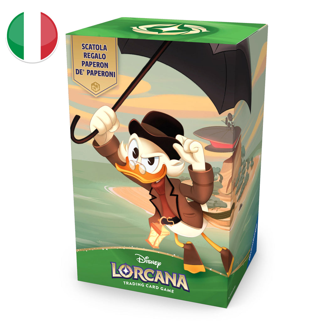 Gift Set Incanto d’Inverno – Lorcana TCG Disney – ITA rappresenta il cofanetto regalo definitivo per collezionisti raffinati che apprezzano stile ed eleganza. Questo gift set premium da collezione è stato progettato per appassionati Disney e collezionisti Lorcana che cercano una combinazione perfetta tra funzionalità e bellezza estetica. Conosciuto anche come scatola regalo Paperone o Scrooge McDuck Gift Box, si distingue per il deck box di qualità superiore con finitura verde smeraldo e artwork spettacolare che ritrae il celebre papero miliardario nelle vesti di Agente S.H.U.S.H.